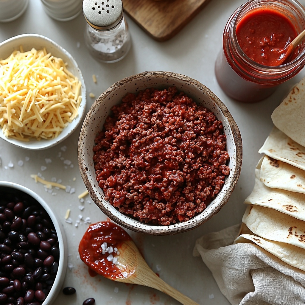- Assemble Enchiladas: Spoon the beef and bean mixture onto the center of each flour tortilla, then roll tightly. Arrange the rolled tortillas seam-side down in a baking dish.