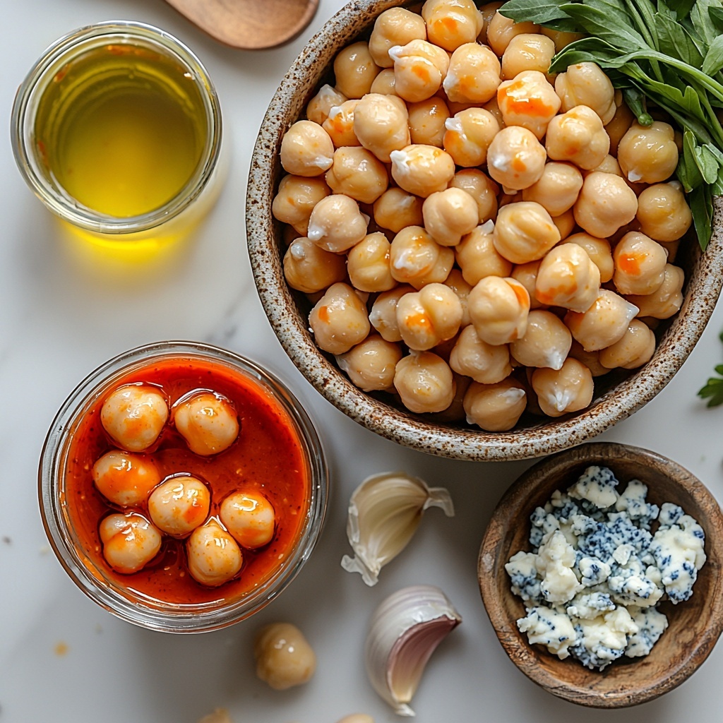 - Gather and prep ingredients: Prepare all ingredients by draining and rinsing the chickpeas, chopping the garlic, and measuring out the buffalo sauce, tahini, lemon juice, and olive oil to ensure smooth blending.