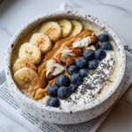 Remove the oats from the fridge and top them with the warm caramelized banana halves. Then, add fresh blueberries for pops of juicy sweetness, a spoonful of almond butter for richness, a dollop of vegan yogurt for creaminess, and finish with a sprinkle of granola for satisfying crunch. Each element brings its own magic, creating a bowl that’s as beautiful to look at as it is delicious to eat.