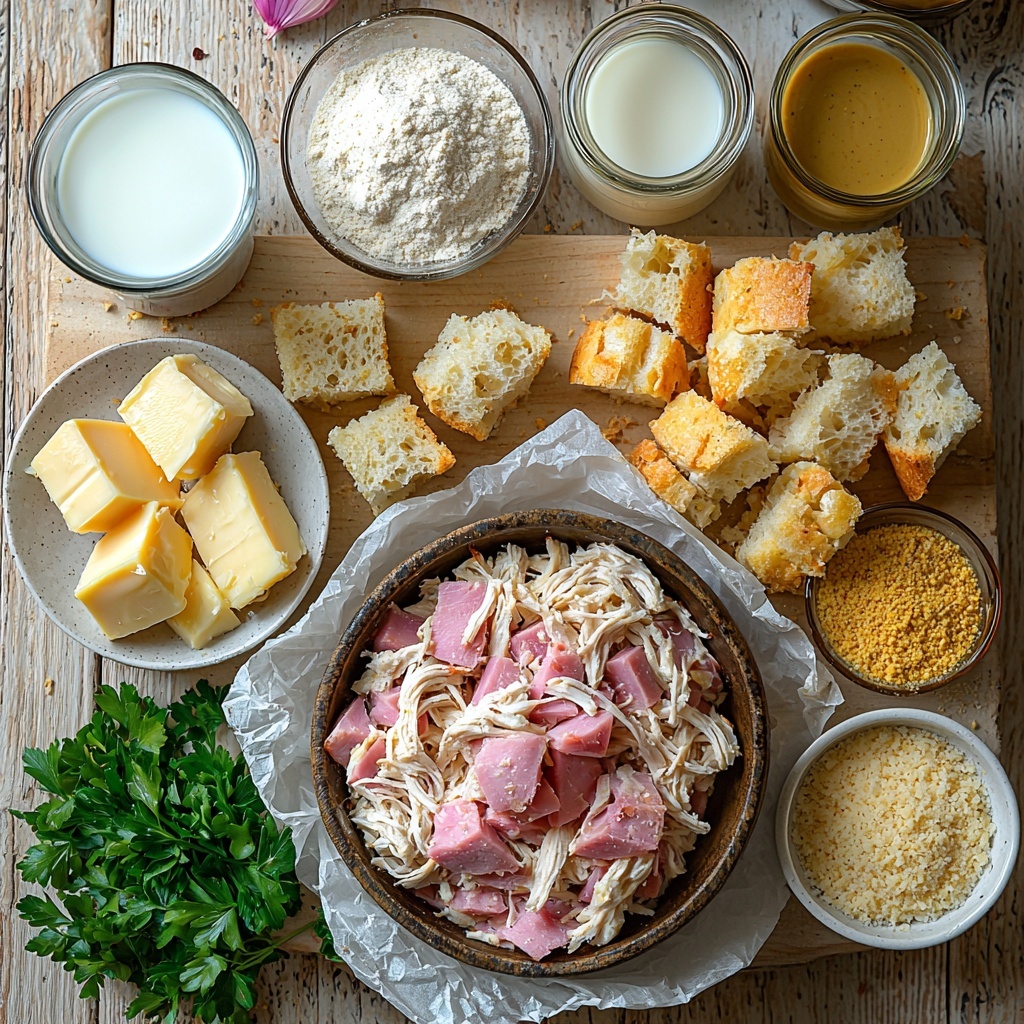 Start by preheating your oven to 375°F and lightly greasing a 9×13-inch baking dish. Spread the cubed day-old bread evenly across the bottom—this layer will soak up all the flavorful sauce later and provide a lovely textural contrast. Next, layer the shredded chicken breast over the bread, then sprinkle the chopped ham, and finally scatter the shredded Swiss cheese on top. These layers set the stage for the creamy sauce to tie everything together.