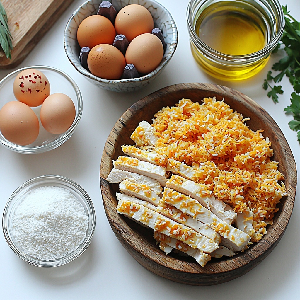 The magic behind Coconut Chicken Strips: Crispy Baked and Fried Delight Recipe is in its simple yet thoughtfully selected ingredients. Each one plays a vital role: the cornstarch helps create that crisp coating, the cayenne adds a hint of heat, and the sweetened coconut flakes bring delightful texture and flavor contrast. Here’s exactly what you’ll gather for this culinary adventure: