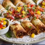 - Serve: Plate the crispy taquitos with the chilled raw mango salsa and garnish with sour cream, finely chopped mangoes, onions, tomatoes, and cilantro for a fresh, colorful presentation.