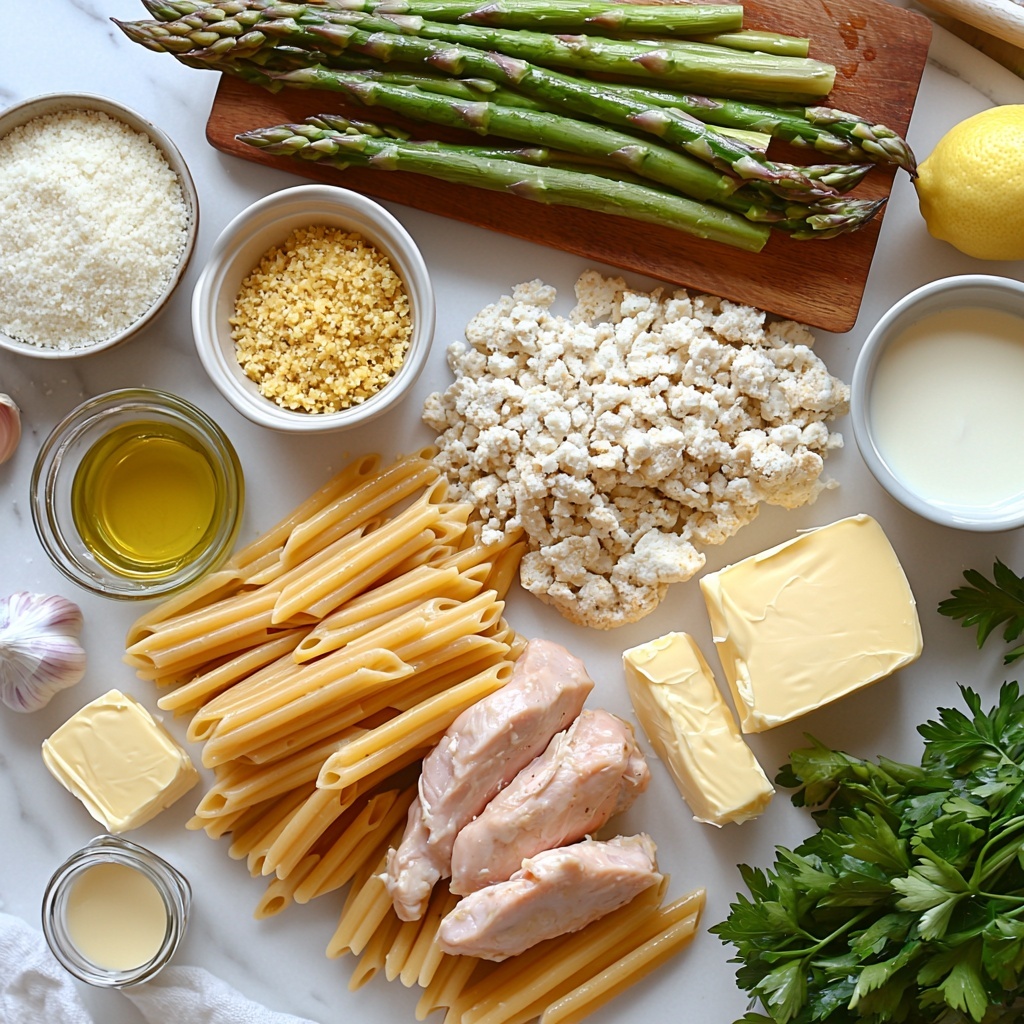 To create this Crispy Parmesan Asparagus Chicken Pasta Recipe, you only need straightforward, wholesome ingredients that each bring something unique to the table—whether it’s the savory depth of cheeses, the brightness of lemon, or the satisfying crunch from the panko topping. They come together beautifully to deliver an impressive dish anyone can enjoy.
