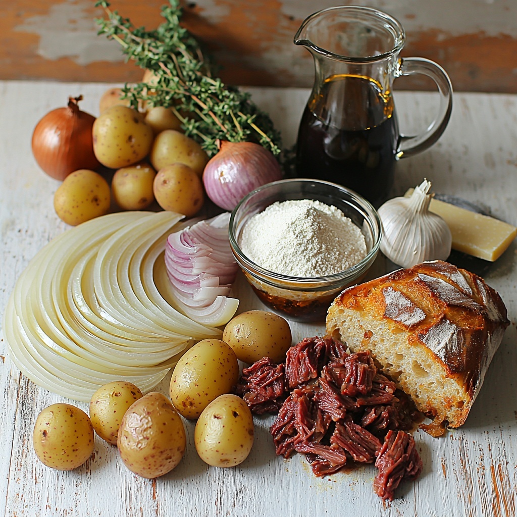 This French Onion Beef Soup is a hearty, savory dish combining tender beef chuck roast with caramelized onions, garlic, and fragrant herbs. Slow-cooked to perfection in a Dutch oven, this flavorful soup is topped with toasted French bread and melted Gruyere cheese for a comforting and classic meal perfect for cool evenings.