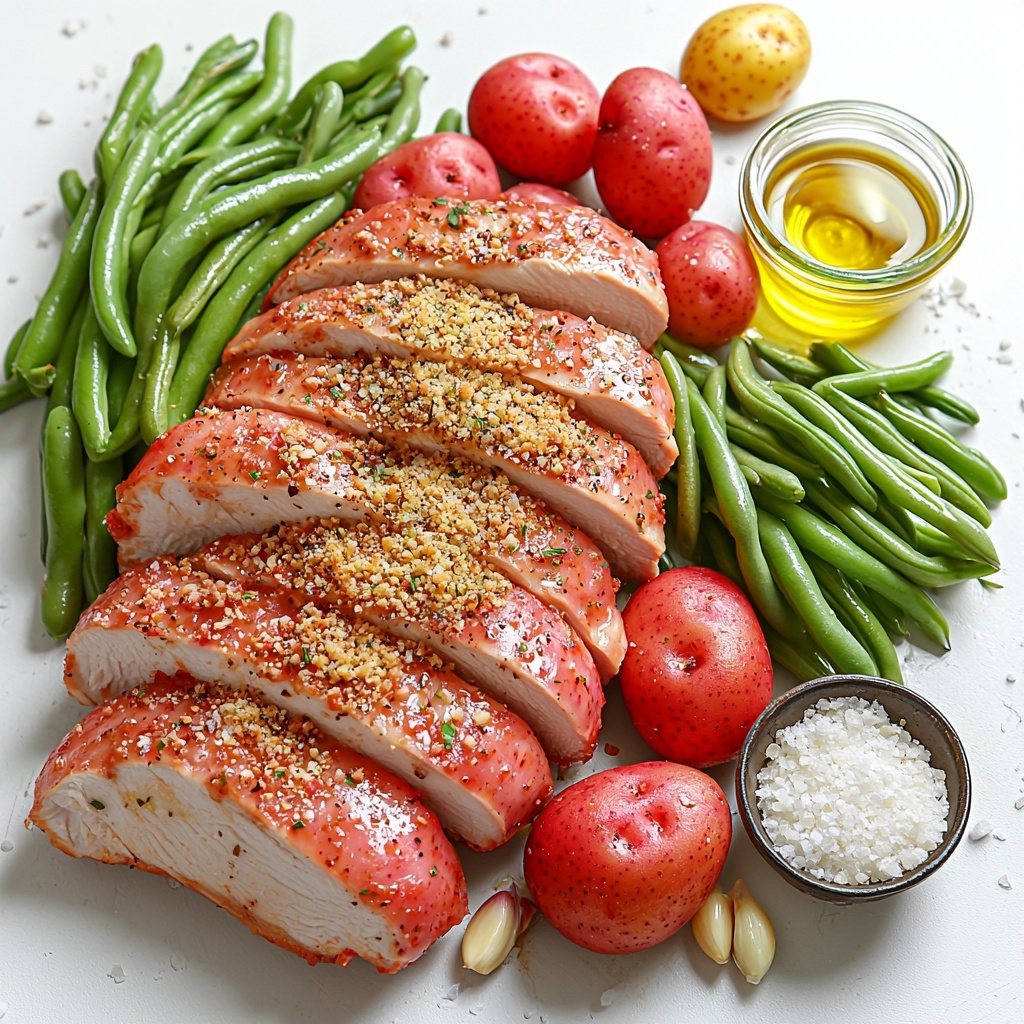 Once the potatoes have had their initial 10-15 minutes, nestle the seasoned chicken breasts on the baking sheet alongside them. Toss the fresh green beans with the remaining olive oil, garlic, salt, and pepper, then add them to the pan as well. Arranging everything on one sheet keeps cleanup easy and lets all those vibrant flavors mingle slightly during baking.