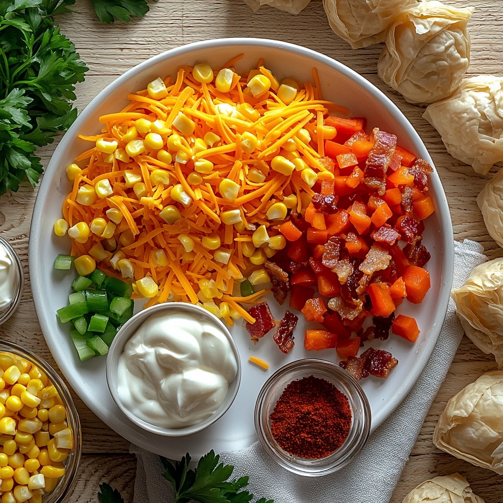 - Combine Filling Ingredients: In a medium bowl, mix together the sweet corn, shredded cheddar cheese, diced red bell pepper, finely chopped green onions, and cooked crumbled bacon if using. This creates a colorful, flavorful filling base.