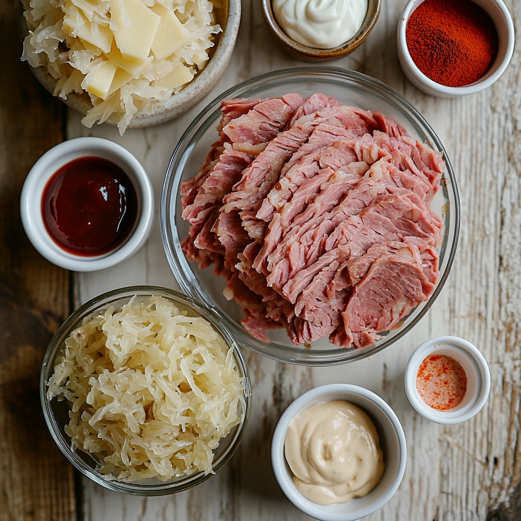 Getting the perfect Keto Crispy Reuben Roll-Ups Recipe starts with simple, quality ingredients. Each one plays a key role: Swiss cheese creates a crispy, savory shell; corned beef brings meaty richness; and sauerkraut adds that essential tangy crunch. The homemade dressing ties everything together with a creamy, zesty finish that truly elevates each bite.