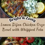 This Lemon Dijon Chicken Orzo Bowl with Lemon Whipped Feta is a refreshing and flavorful 30-minute meal perfect for a quick weeknight dinner. Tender grilled chicken breasts marinated in a zesty lemon Dijon mixture are served over a bed of tender orzo tossed with fresh spinach and cherry tomatoes. The bowl is finished with a creamy, tangy lemon whipped feta sauce that adds a bright and rich dimension to this wholesome, Mediterranean-inspired dish.