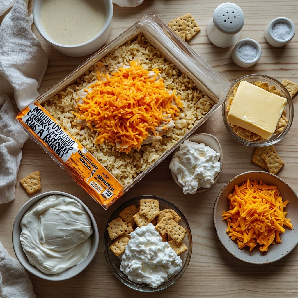 Gathering your ingredients for the Million Dollar Chicken Rice-A-Roni Casserole Recipe is straightforward and rewarding—each item brings a unique contribution to the rich flavors and luscious texture you’ll love. From the savory chicken Rice-A-Roni to the cheesy components and crunchy topping, these ingredients work beautifully together.