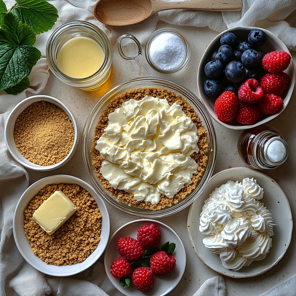 The magic of this No-Bake Classic Cheesecake with Fresh Berries Recipe lies in its simplicity. Every ingredient plays an essential role, creating a harmonious dessert with a crisp crust, fluffy filling, and refreshing fruit topping. Here’s what you’ll need: