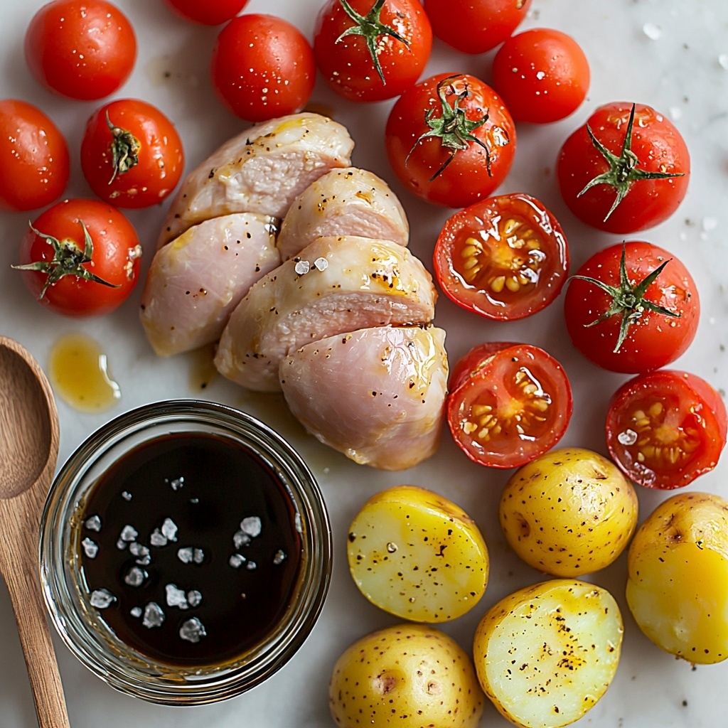 - Prepare Chicken and Vegetables: Place the chicken breasts onto the prepared baking sheet. Drizzle some of the balsamic glaze over the chicken. In a separate bowl, toss the halved cherry tomatoes and baby potatoes with the remaining balsamic mixture. Arrange the vegetables evenly around the chicken on the baking sheet.