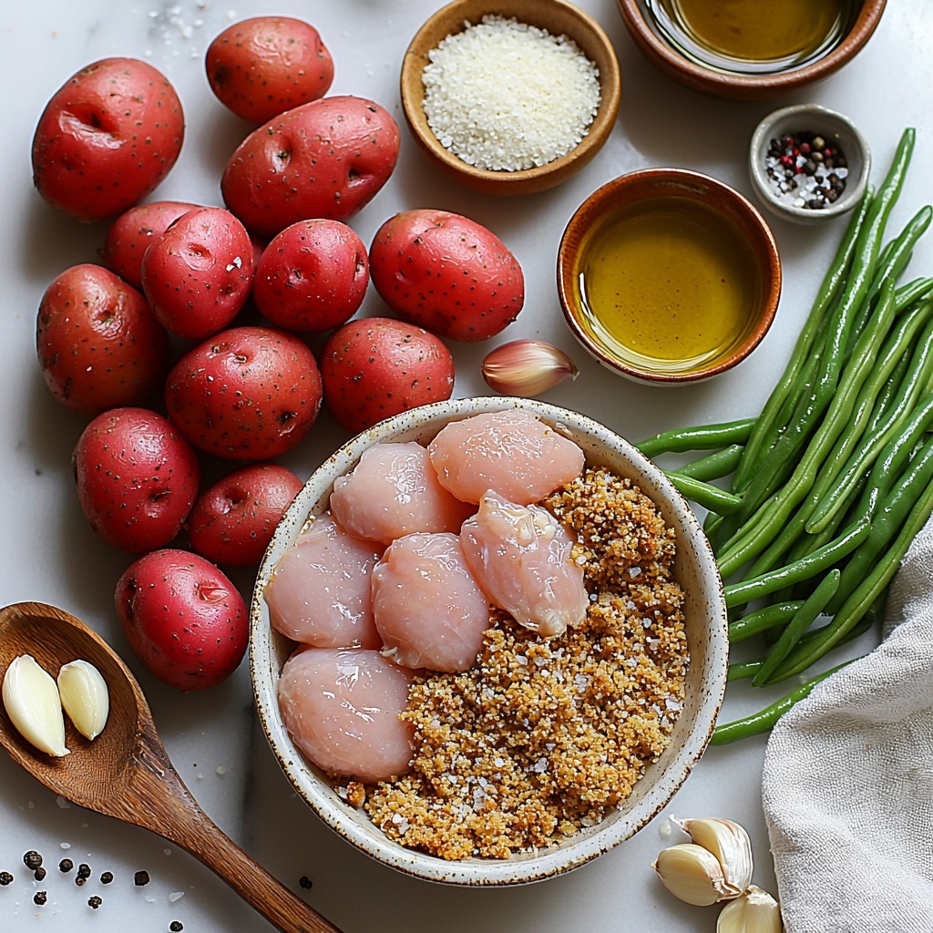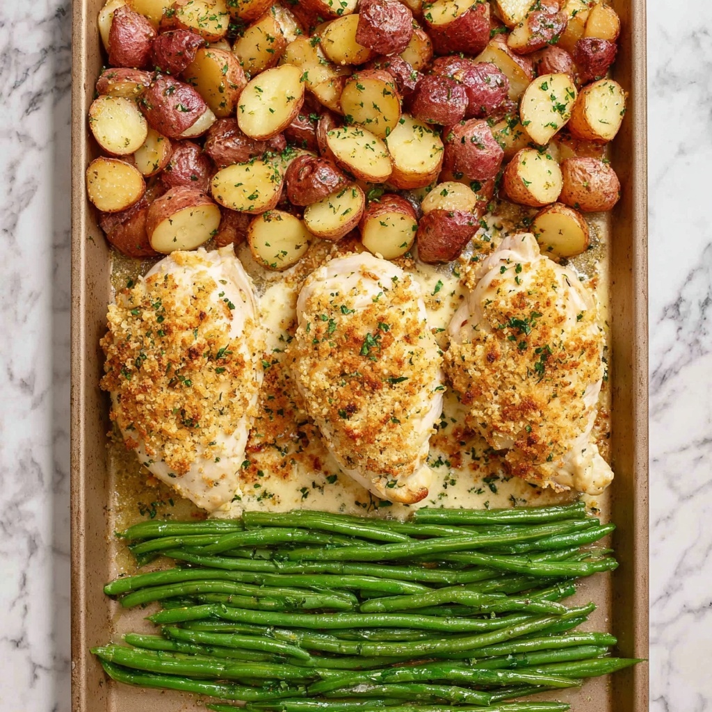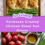 This Parmesan Crusted Chicken Sheet Pan Dinner is a flavorful, all-in-one meal featuring juicy chicken breasts crusted with Parmesan and breadcrumbs, roasted alongside crispy red potatoes and fresh green beans. The recipe is simple, uses minimal cleanup with just one sheet pan, and delivers a balanced combination of protein, vegetables, and a crunchy, savory crust.