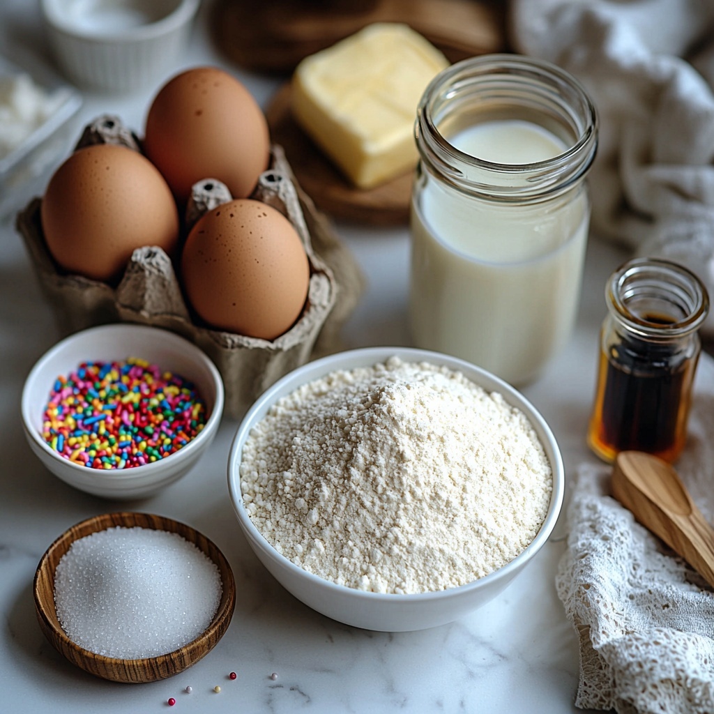 Gathering simple, classic ingredients is the first step to crafting these charming treats. Each component plays an essential role in achieving the perfect balance of moistness, sweetness, and those cheerful sprinkles that make these cupcakes truly special.