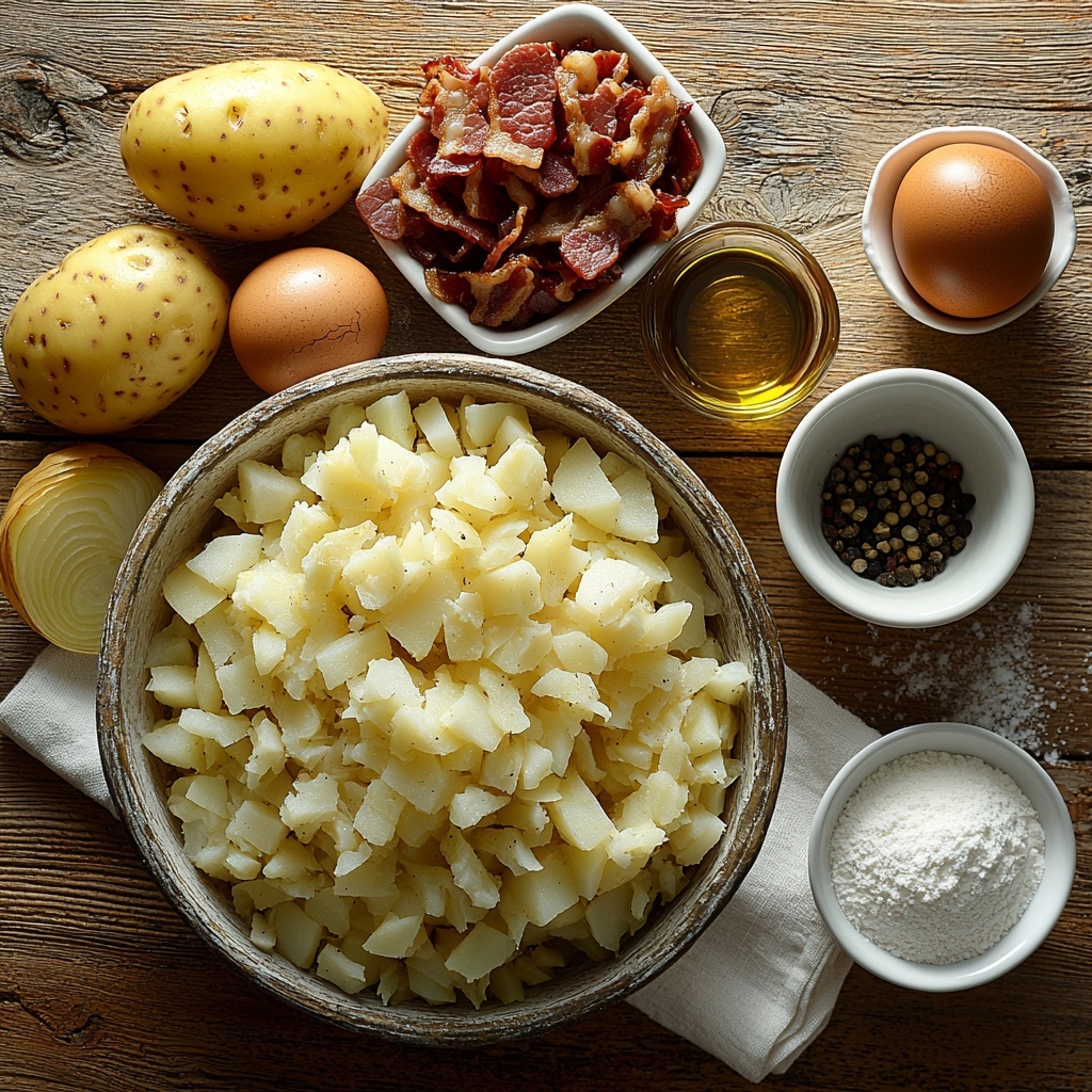 - Mix Ingredients: In a large bowl, combine the grated potatoes and onions with the diced smoked bacon, egg, flour, salt, and pepper. Mix well to form a consistent batter.
