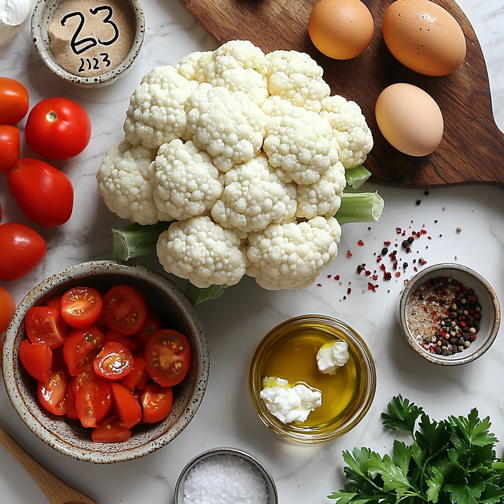 - Combine and bake: In a large bowl, mix the roasted cauliflower slices with the tomato sauce until well combined. Transfer this mixture to a greased baking dish. In a small bowl, beat together the eggs and crumbled goat cheese until smooth. Pour this mixture evenly over the cauliflower and tomato base. Bake in the oven at 450°F (230°C) for about 30 minutes, or until the top is nicely browned and set.