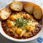 For a cozy family-style meal, serve the Simple Baked French Onion Gnocchi Recipe directly in the baking dish. If you’re impressing guests, plate individual portions in warm shallow bowls and drizzle extra sauce over the top. You can also place the French bread slices standing around the dish for a charming, rustic vibe.