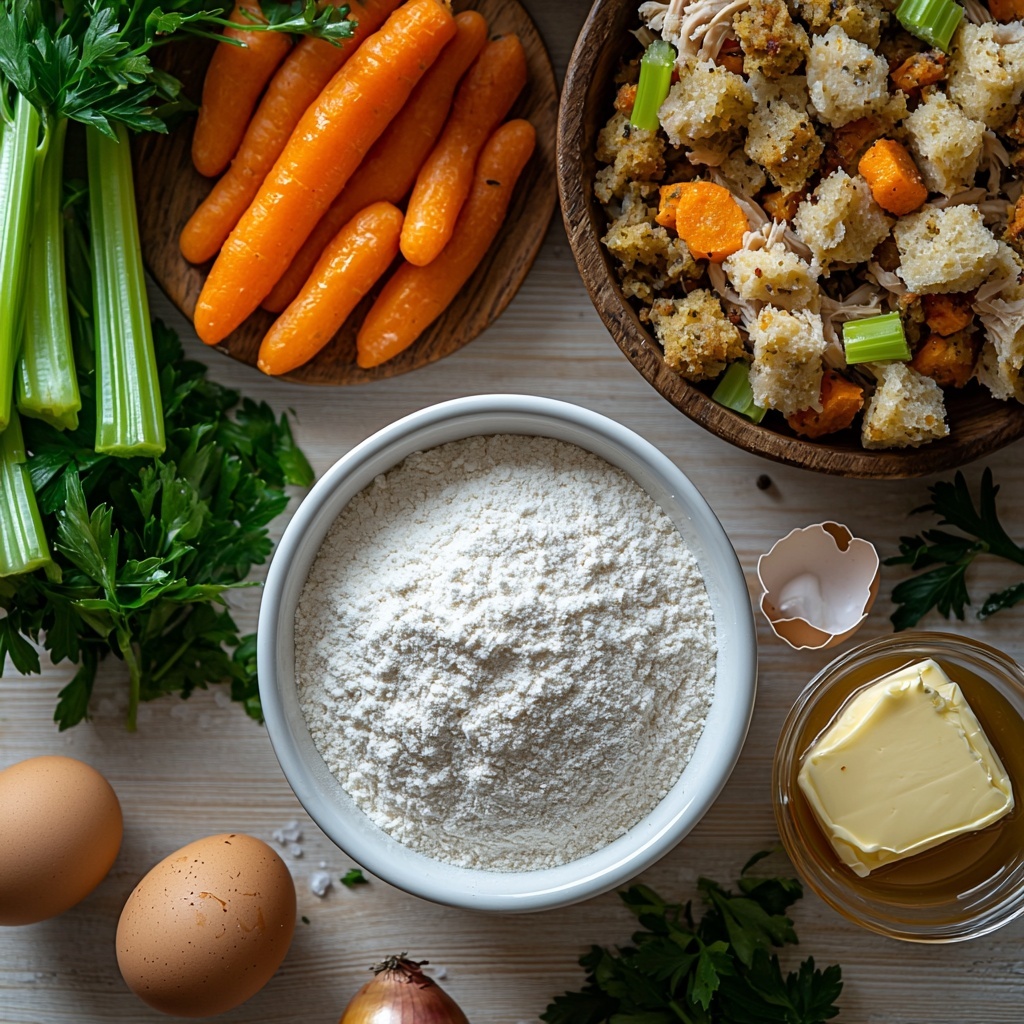 Start by combining the flour, eggs, and chopped fresh parsley in a mixing bowl. These ingredients create a simple dough base with a peppery herbaceous note. Next, add the leftover stuffing and stir until everything is evenly mixed. This mixture will be the flavorful dumplings that add heartiness and a fun texture to your soup.