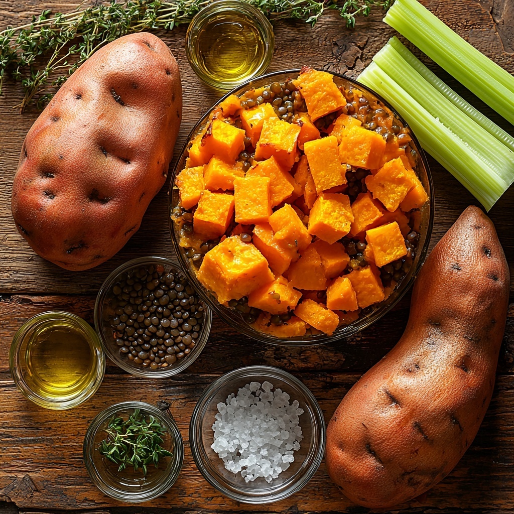 These ingredients are simple staples that come together to create layers of incredible flavor and texture. Each one plays a key role, from the natural sweetness and creamy texture of the sweet potatoes to the hearty earthiness lentils bring, and the aromatic herbs that round out the dish beautifully.
