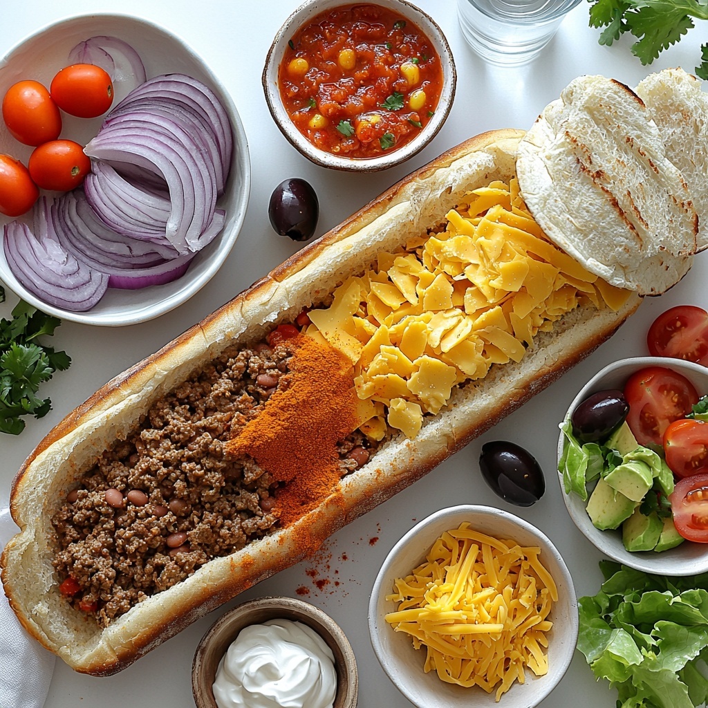 This Taco French Bread Pizza Recipe uses straightforward ingredients that are easy to find yet pack a powerful punch in flavor and texture. Each component plays an essential role in balancing richness, spice, and freshness that makes every bite unforgettable.