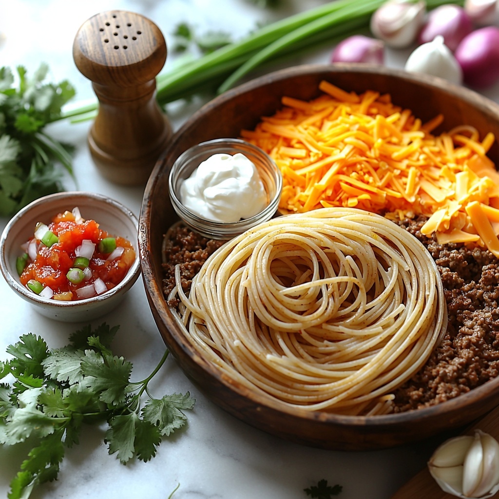 With just a handful of pantry staples and fresh produce, this Taco Spaghetti Recipe comes together effortlessly. Each ingredient plays a crucial role from building flavor to adding texture and color, ensuring that every bite is packed with vibrant taste and comforting familiarity.
