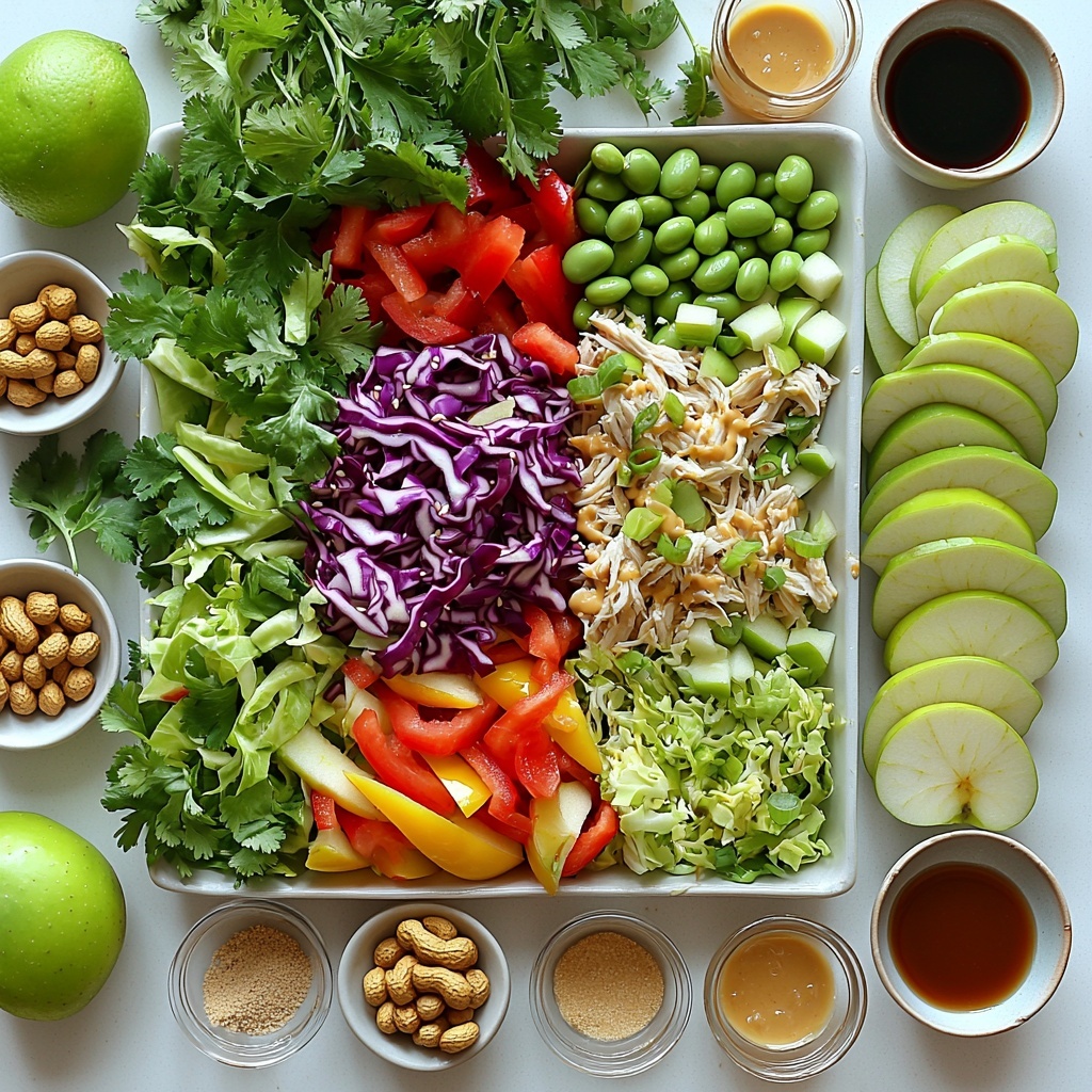 In a large bowl, toss together your slaw mix, thinly sliced red and yellow bell peppers, cooked chicken, chopped honey crisp apple, thawed edamame, fresh cilantro leaves, and chopped scallion greens. The variety of colors and textures here already looks inviting, bringing together crunch, sweetness, and savory bites.