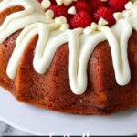 A luscious White Chocolate Raspberry Bundt Cake featuring a moist white cake swirled with vibrant raspberry pie filling and studded with white chocolate chips. Topped with a smooth cream cheese frosting, this cake is perfect for celebrations or a decadent dessert treat.